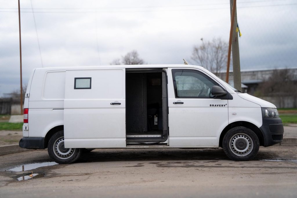 Genau für die eben erwähnten Evakuierungsfahrten haben wir zusammen mit der Deutsch Ukrainischen Gesellschaft e.V. aus Berlin einen gepanzerten Volkswagen finanziert. Dieses Fahrzeug ist beschusssicher und arbeitet ergänzend zu den gelieferten Schutzwesten. Hydraulische Türen innen und außen machen die Arbeit schnell und effizient. Weiß als Farbe signalisiert den Humanitären Aspekt der Mission.