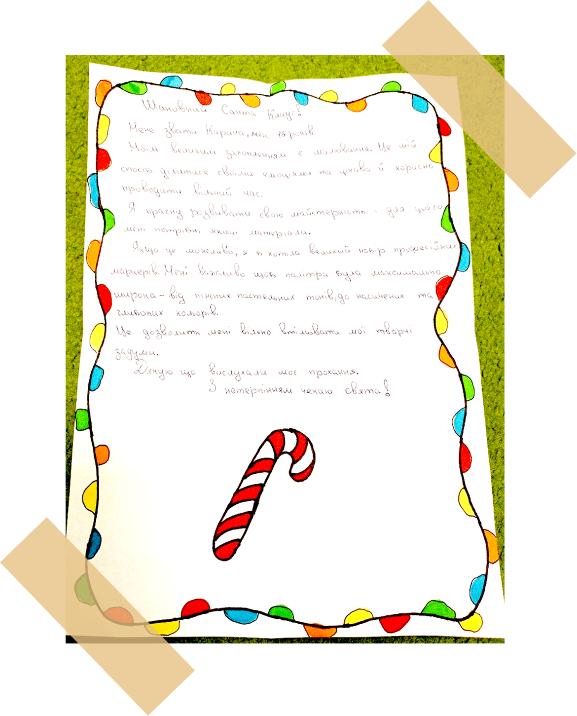 Lieber Weihnachtsmann, mein Name ist Karina, ich bin 15 Jahre alt. Meine große Leidenschaft ist das Zeichnen. Es ist meine Art, meine Gefühle auszudrücken und meine Freizeit interessant und sinnvoll zu verbringen. Ich möchte meine Fähigkeiten weiterentwickeln, und dafür brauche ich hochwertiges Material. Wenn es möglich ist, würde ich mich sehr über ein großes Set professioneller Marker freuen. Wichtig ist mir, dass die Farbpalette möglichst breit ist – von zarten Pastelltönen bis hin zu kräftigen und tiefen Farben. Das wird mir helfen, meine kreativen Ideen vollständig umzusetzen. Vielen Dank, dass Sie meine Bitte angehört haben.
