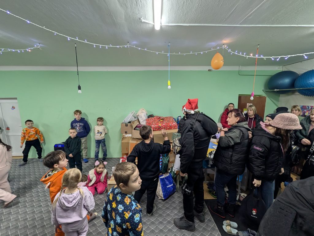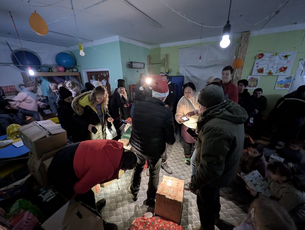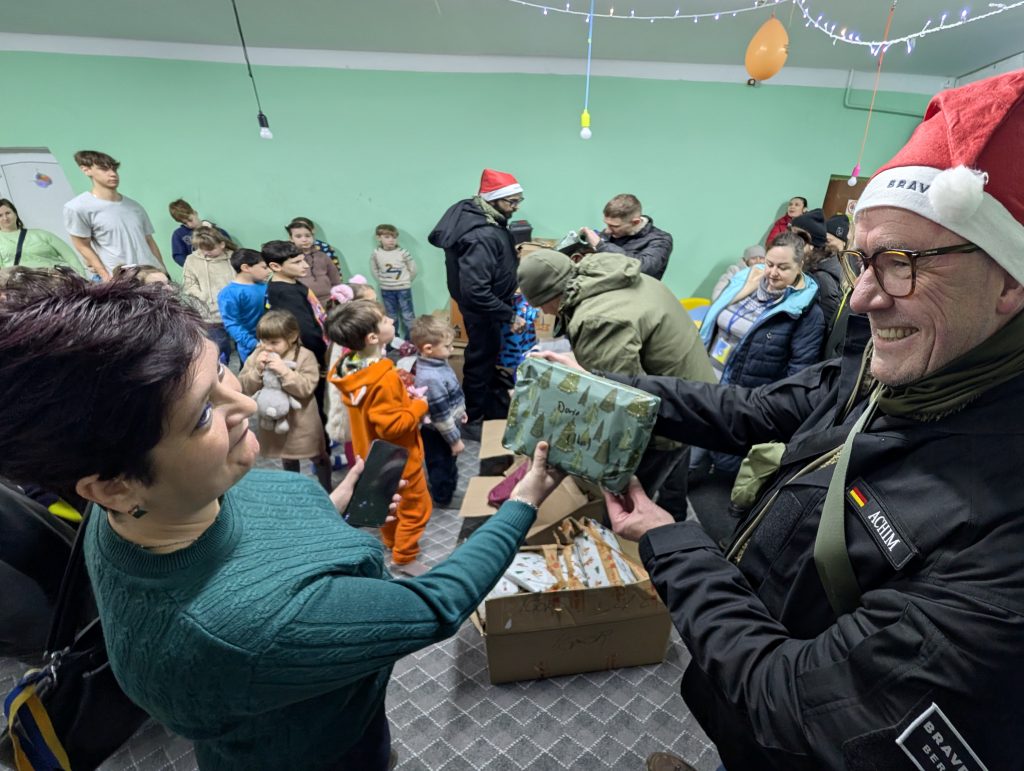 Während das Team zusammen mit unserem Partner und Freund Enno Lenze die Geschenke austeilt wird es bereits mit der ersten Explosion konfrontiert – Eine Fpv Drohne fliegt 50-80m neben ihnen in den Baum. Auch während der Übergabe kommt es zu Artilleriebeschuss – der Strom fällt aus. Abbruch? Nein danke. Die Notbeleuchtung geht an und es wird weiter verteilt, die Kinder scheinen sichtlich unbeeindruckt durch den Blackout.